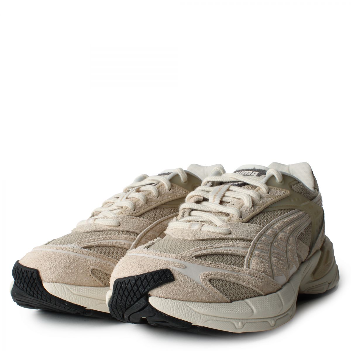The Velophasis was created by blended references from a similar design aesthetic to create something new and authentic. Its silhouette is a 2000s hybrid loosely inspired by PUMA’s heritage performance running range. The Velophasis SD features a mesh upper with a hairy suede overlays and debossed graphic lines. Transluced molded overlays perfectly hold the shape of the shoe and emphasise its look.